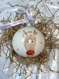 Personalised ceramic bauble featuring a hand or footprint, finalised with hand painting. All baubles include one print, hand painted text, ribbon and gift box.